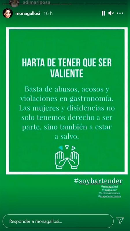 Luego en sus historias de Instagram continuó con su descargo: “Harta de tener que ser valiente. Basta de acosos, abusos y violaciones en gastronomía. Las mujeres y disidencias no solo tenemos derecho a ser parte, sino a estar a salvo”.