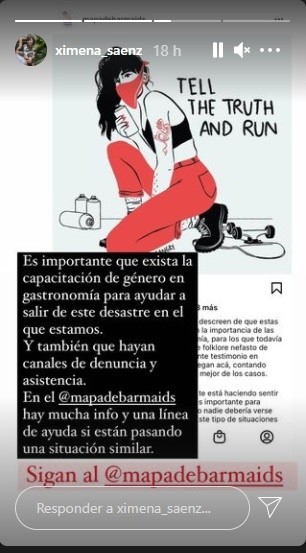 Mientras que Ximena Saenz, ex conductora de “Cocineros Argentinos”, fue de las primeras en comentar su publicación: “Un abrazo grande Trini. Es muy valiente e importante tu relato. Esto tiene que parar ya“. Y desde su cuenta de Instagram manifestó su preocupación por la falta de capacitación en género en el mundo de la gastronomía. Además, recomendó la asistencia de la ONG Mapa de Barmaids & Afines.