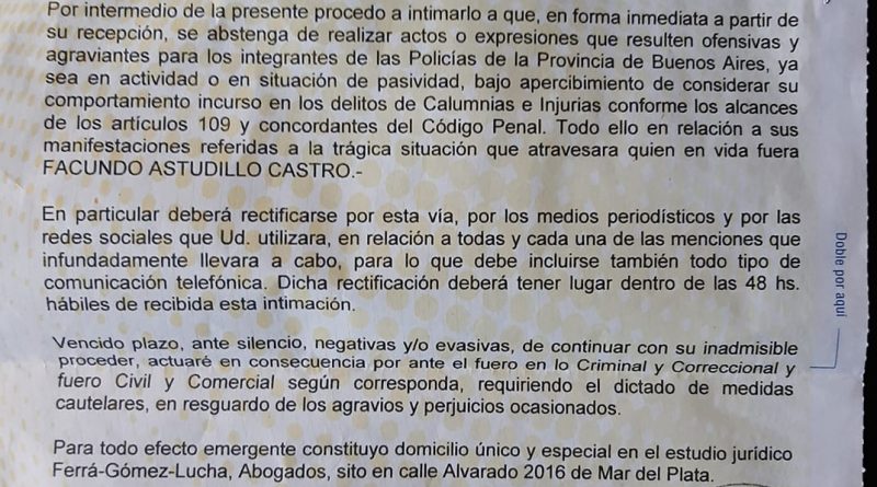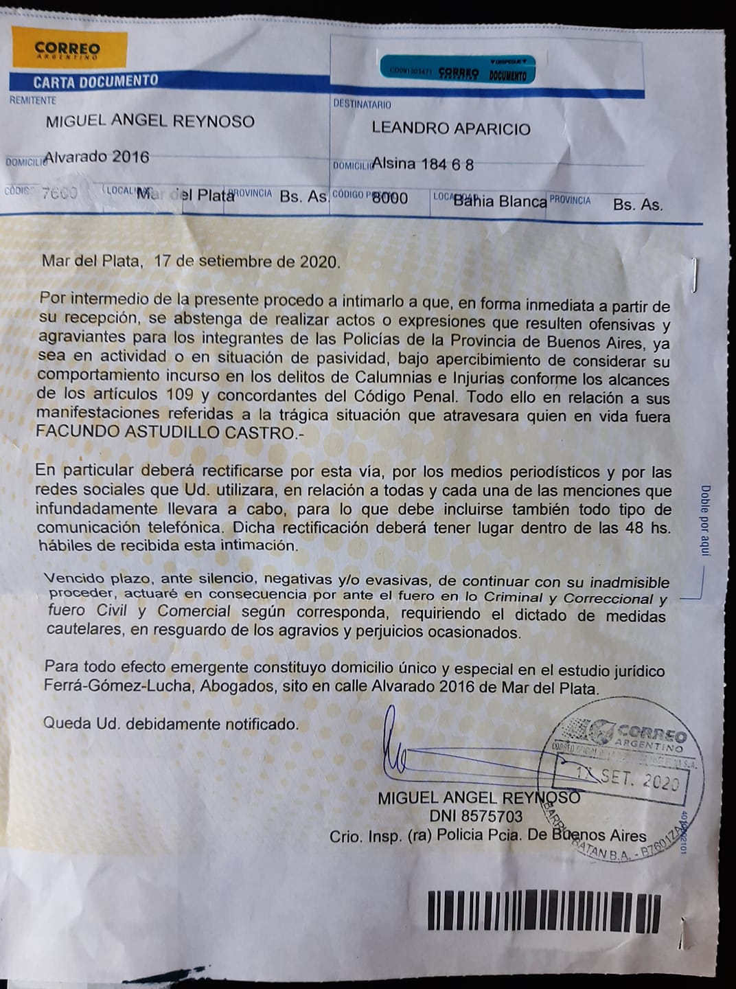 Un comisario retirado intimó al abogado Leandro Aparicio a que “se abstenga de realizar actos o expresiones que resulten ofensivas y agraviantes para los integrantes de las Policías de la provincia de Buenos Aires, ya sea en actividad o en situación de pasividad, bajo apercibimiento de considerar su comportamiento incurso en los delitos de calumnias e injurias”.