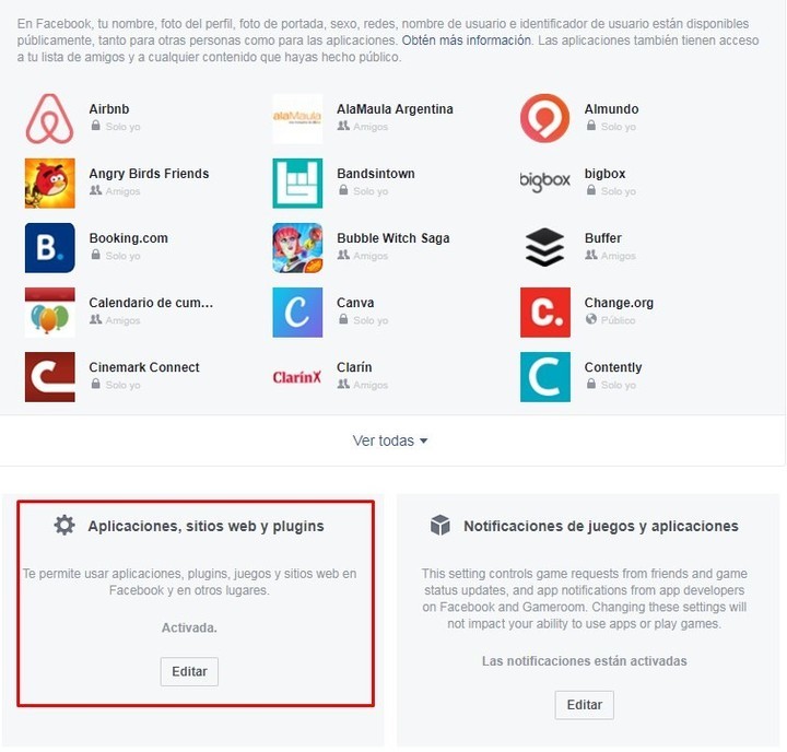 Justamente en esta sección podrás eliminar o editar los permisos que cada una de las aplicaciones donde alguna vez hayas usado tu cuenta de Facebook para conectarte o haya solicitado acceso a tu cuenta. Podrás seleccionar en cada una los elementos del listadoy eliminarlo, o editar los permisos. La recomendación más sensata sería eliminar todas las que no reconozcamos.