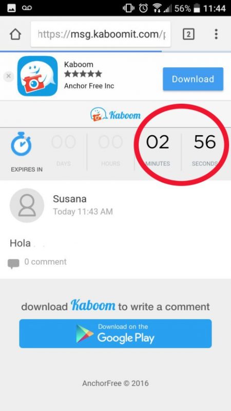 Cuando tu contacto abra el enlace, se redirigirá a Kaboom en donde podrá ver tu mensaje y el tiempo que queda para verlo.