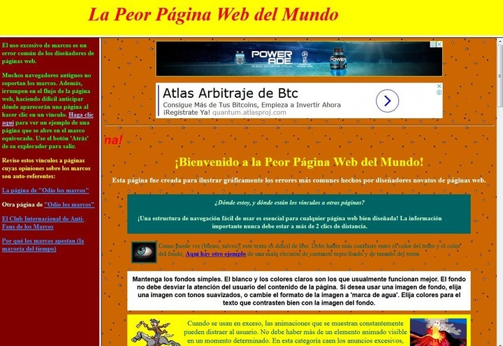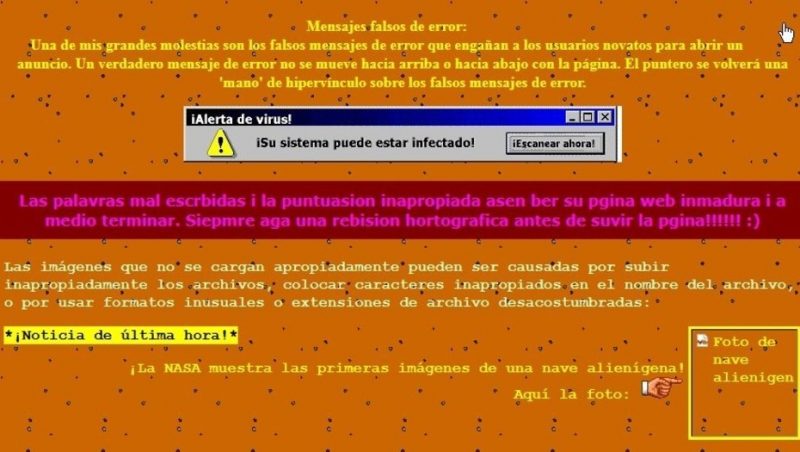 explica el motivo de tan desagradable diseño: “Esta página fue creada para ilustrar gráficamente los errores más comunes hechos por diseñadores novatos de páginas web”.