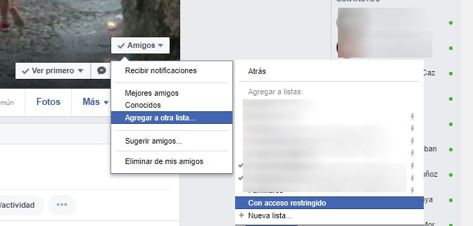 Para añadir a alguno de nuestros amigos a la lista de personas con acceso restringido tenemos dos opciones. La primera de ellas es buscar a ese amigo, ir a su perfil y poner el puntero del ratón sobre el botón Amigos que aparece a la derecha de su foto de portada. Ahí se nos mostrarán una serie de opciones, entre las que encontraremos Agregar a otra lista. Pulsamos sobre esta opción y a continuación elegimos Con acceso restringido.