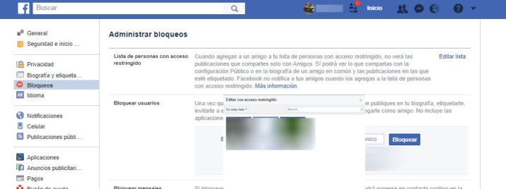 La otra opción es desplegar las opciones de menú desde la página principal de nuestro Facebook, ir a Configuración y a continuación pulsar sobre la opción Bloqueos que aparece en el lateral izquierdo de la página. Esto nos cargará una serie de ajustes en donde encontraremos en primer lugar Lista de personas con acceso restringido. Si pulsamos en Editar lista, podremos ir buscando y seleccionando aquellos amigos que queremos añadir a esta lista.