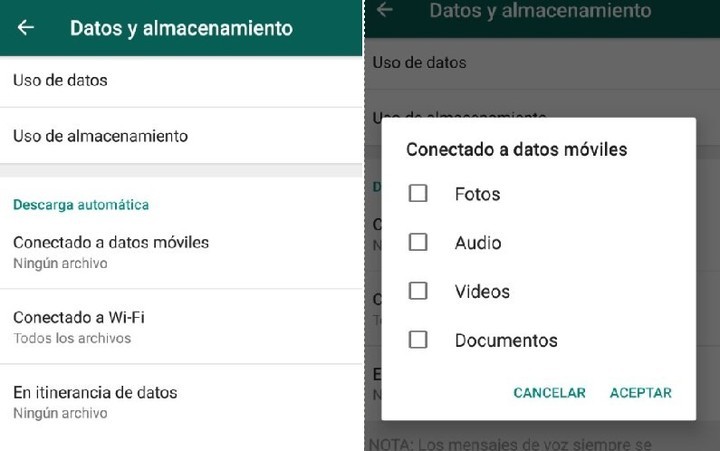 Para los teléfonos con Android hay que abrir la pestaña de ajustes a partir del icono de los tres puntos verticales en la esquina superior derecha. En “Ajustes” hay que dirigirse al apartado “Datos y almacenamiento” y después clickear en “Descarga automática”. Hay se ven cuatro opciones: imágenes, audio, video y documentos. Para cancelar la descarga automática se desactiva el “check” del elemento multimedia que se quiera o de todos ellos si no querés que se almacenen en la galería del dispositivo.