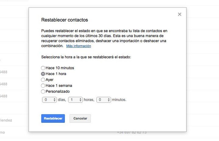 Una vez en el modo clásico, en las opciones ubicadas dentro de la pestaña “Más”, habrá que elegir “Restablecer contactos” y esto nos abrirá una ventana en la que seleccionaremos el período de tiempo al que queramos que se restablezca. De más está decir que lo recomendable es señalar mayor período posible que nos permita la opción manual.