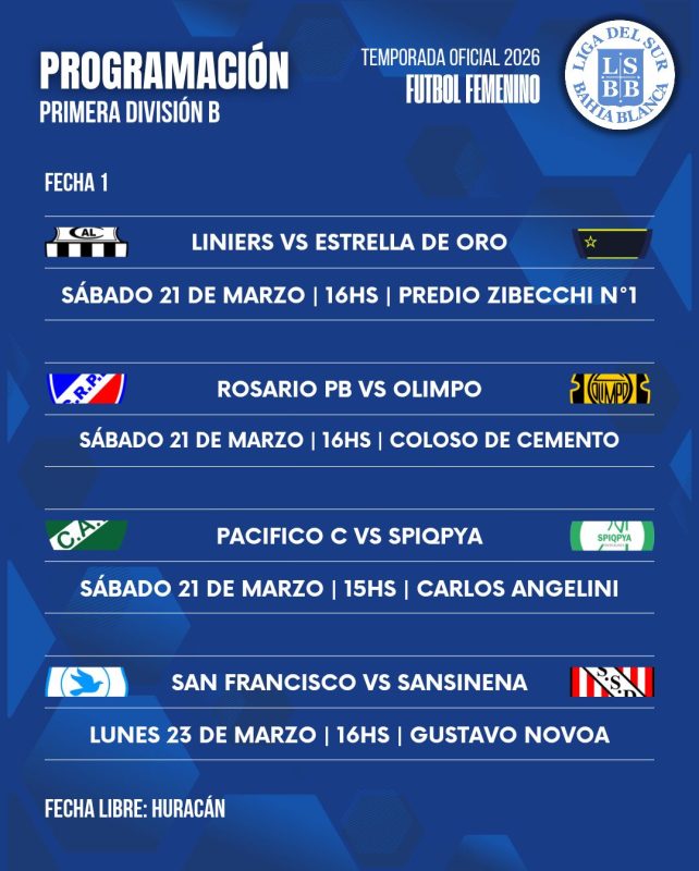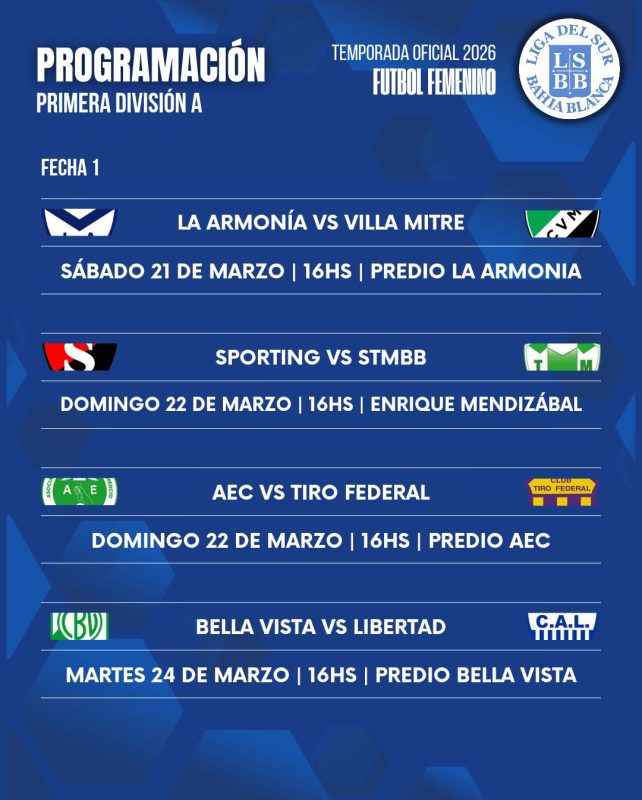 La Liga del Sur informó la programación de la fecha 1 del Torneo Apertura en las categorías Primera A y Primera B del fútbol femenino.