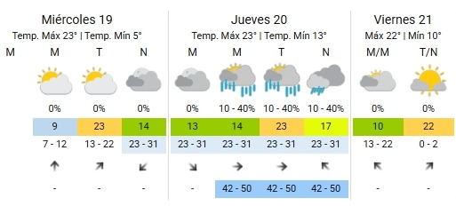 El viento soplará del sector oeste y sudoeste, con intensidades que llegarán a ráfagas de 42 a 50 km/h del oeste, especialmente en la tarde y noche.