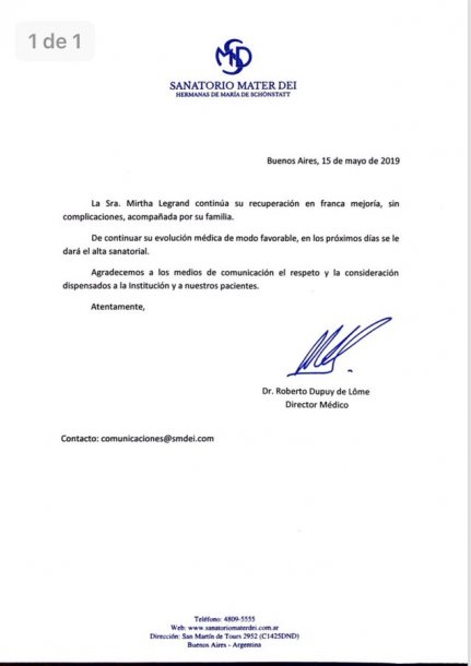 De continuar su evolución médica de modo favorable, en los próximos días se le dará el alta sanatorial”, informa el comunicado firmado por el director médico del sanatorio, el doctor Roberto Dupuy de Lôme, y agrega: “Agradecemos a los medios de comunicación el respeto y la consideración dispensados a la institución y a nuestros pacientes”.