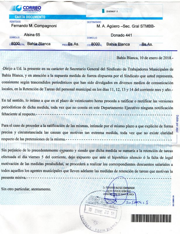 El secretario de Gobierno, Fernando Compagnoni, le pidió a través de una carta documento al secretario general del Sindicato de Empleados Municipales (STMBB), Miguel Agüero, que dé explicaciones acerca de las razones que sostienen la retención de tareas que comenzaron los trabajadores de la comuna este jueves y se extenderá hasta el lunes.