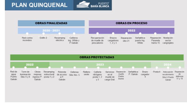 Entre las obras diagramadas se prevén importantes y necesarias inversiones en adquisición de equipamiento como la compra de tres brazos cargadores para los sitios 1 y 3 y readecuación general de la estructura del sitio 1 de la posta para Inflamables; recambio de defensa en el sitio 5 de Puerto Galván y tendido de fibra óptica en diversos sectores del área portuaria.