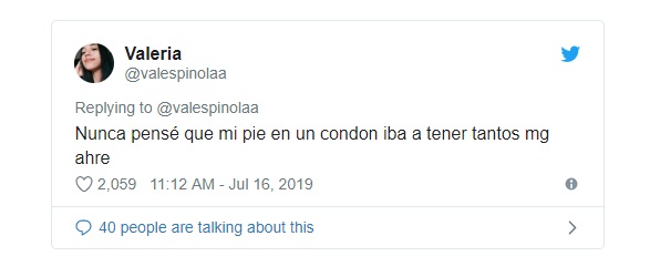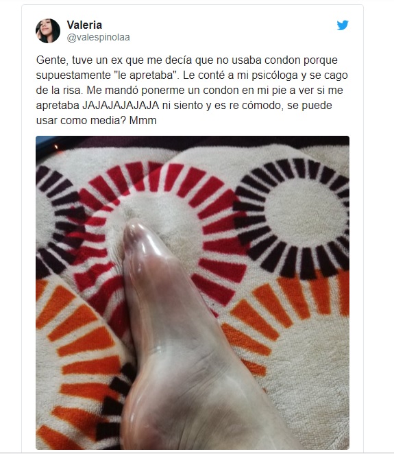 ¿Qué hizo para refutar este mito? Se puso el preservativo en el pie. “Me mandó ponerme un condón en mi pie a ver si me apretaba JAJAJAJAJAJA ni siento y es re cómodo, se puede usar como media?”, concluyó la joven.