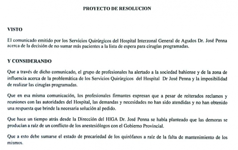 Los concejales Adrián Jouglard (Juntos) y Valeria Rodríguez (Avanza Libertad) presentaron un pedido de informe a las autoridades sanitarias regionales y provinciales sobre la situación del Hospital Penna, luego de que varios médicos del nosocomio expresaran que “se han visto obligados a no agregar más pacientes a las listas de espera para cirugías programadas” por “falta de equipamiento y de personal”.
