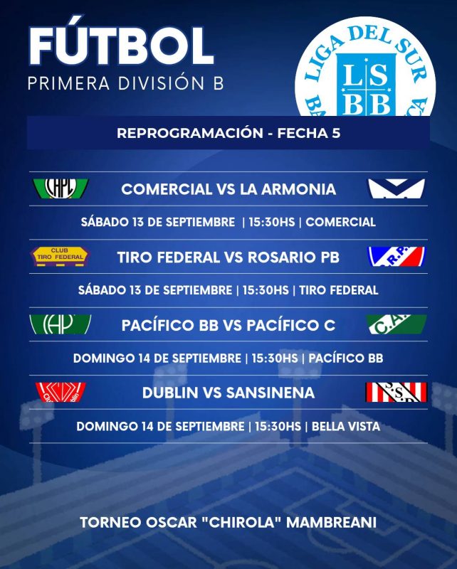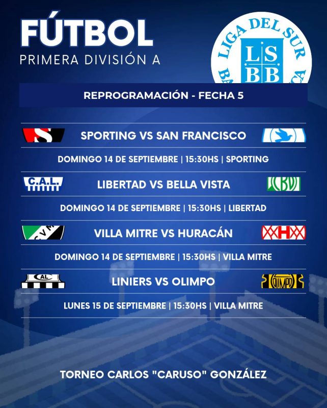 La Liga del Sur confirmó la programación de la fecha 5 del Torneo Clausura de Primera A y Primera B, que se jugará este fin de semana.