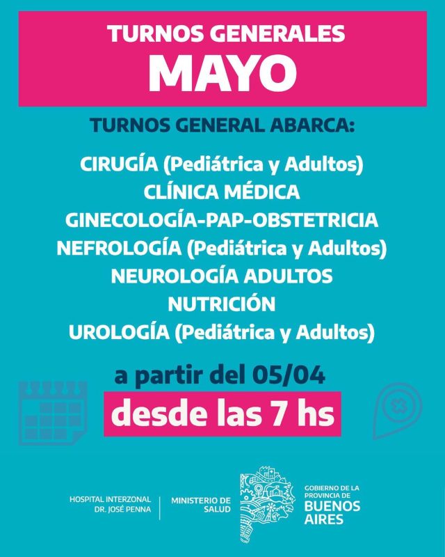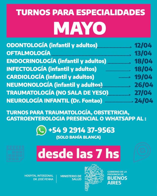 El Hospital Penna de Bahía Blanca anunció “las fechas exactas de abril en las que se podrá sacar turnos para el mes de mayo”.