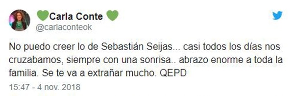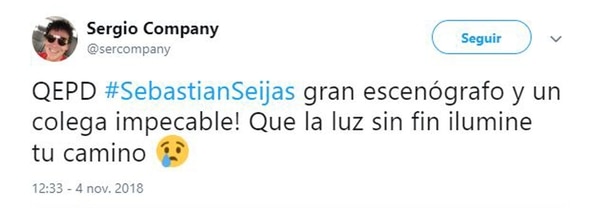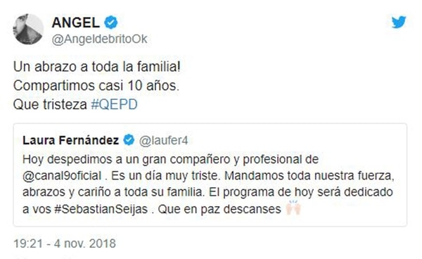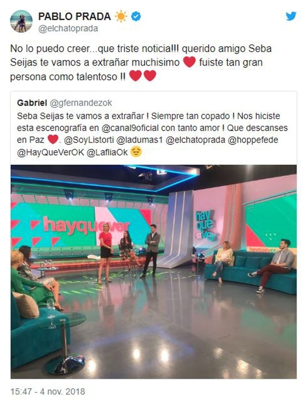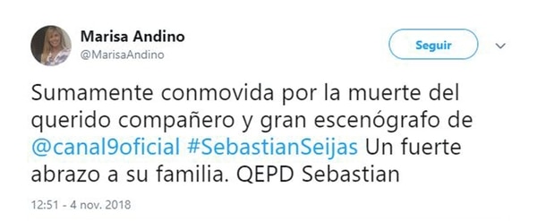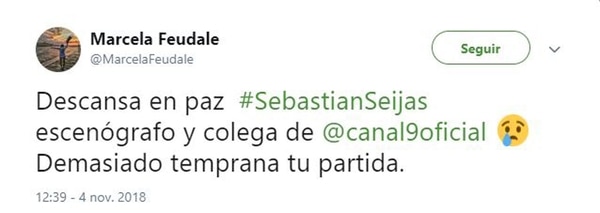 Marcela Feudale, por su parte, escribió: “Descansá en paz #SebastianSeijas, escenógrafo y colega de @canal9oficial. Demasiada temprana tu partida“.