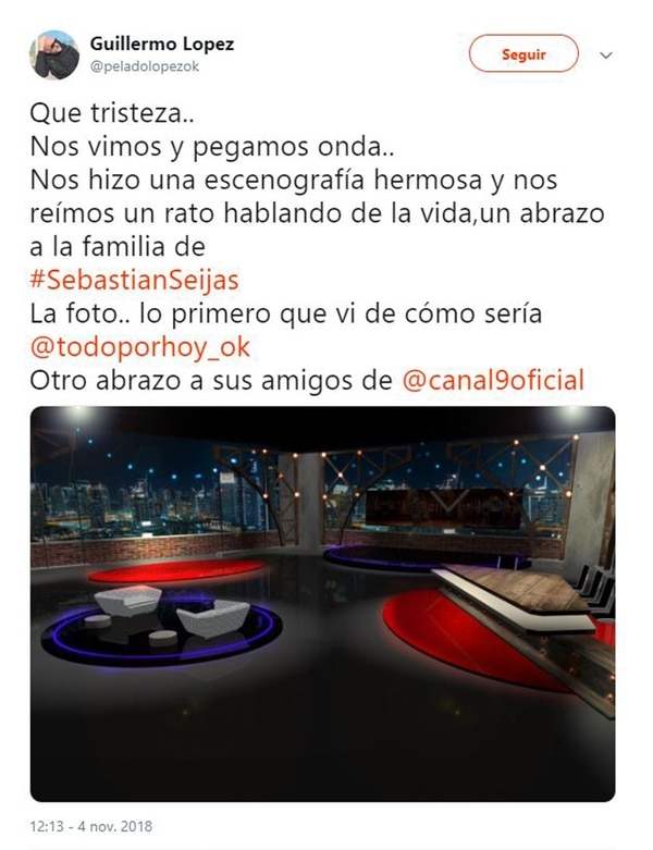“Qué tristeza… Nos vimos y pegamos onda. Nos hizo una escenografía hermosa y nos reímos un rato hablando de la vida. Un abrazo a la familia de #SebastiánSeijas. La foto… Lo primero que vi de cómo sería @todoporhoy_ok. Otro abrazo a los amigos de @canal9oficial“, escribió el Pelado López.