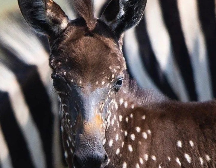 La peculiaridad del animal no se debe unicamente a los lunares, sino también a los colores invertidos, ya que las cebras son blancas con rayas negras y esta es marrón con puntos blancos.