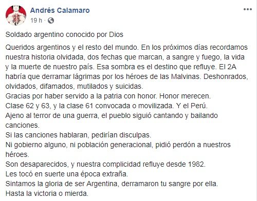 En medio de homenajes y reconocimientos, Andrés Calamaro publicó una emotiva carta la cual tituló “Soldado argentino conocido por Dios”, frase que aun se lee en las lápidas de miles de combatientes que murieron durante la guerra y cuyos restos sin ser identificados descansan en el Cementerio de Darwin, en la isla Soledad.