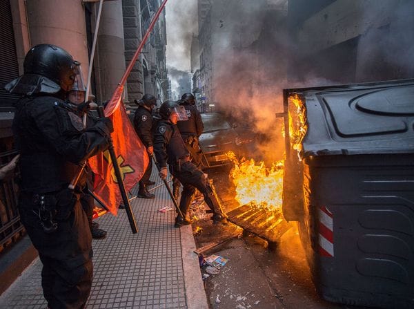 Desde las primeras horas de hoy, hubo contactos entre los funcionarios de Seguridad de la Casa Rosada y los del Gobierno porteño. La línea de análisis de la protesta social en la avenida 9 de Julio era coincidente: entre los manifestantes había sectores de Quebracho, Corriente Patria Grande y grupos con banderas del municipio bonaerense de La Matanza enrolados en la protesta. Tanto Macri como Rodríguez Larreta y María Eugenia Vidal ven en las sombras de estos manifestantes encapuchados y con palos amenazantes la mano invisible de Cristina Kirchner.