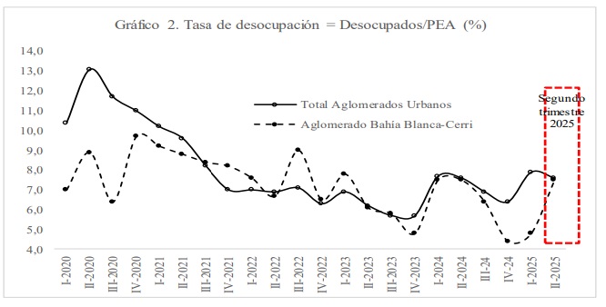 “Con 7,5% de la población bahiense económicamente activa sin trabajo y buscándolo activamente, la tasa de desempleo retornó a los elevados niveles alcanzados a principios de 2024, cuando el paquete de medidas económicas del nuevo gobierno estaba produciendo un efecto contractivo sobre el nivel de actividad económica y el mercado de trabajo urbano en todo el país”, señala el informe.