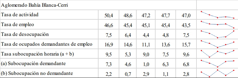 “La segunda consecuencia del retroceso del empleo fue la disminución de la tasa de actividad. De hecho, si se observan conjuntamente las tasas de empleo y de actividad en Bahía Blanca-Cerri desde mediados de 2023 se notará la estrecha solidaridad entre ambas trayectorias. En efecto, en la medida en que las personas sin empleo o que lo pierden abandonan la búsqueda laboral dejan de contar como económicamente activos”, explica el informe.