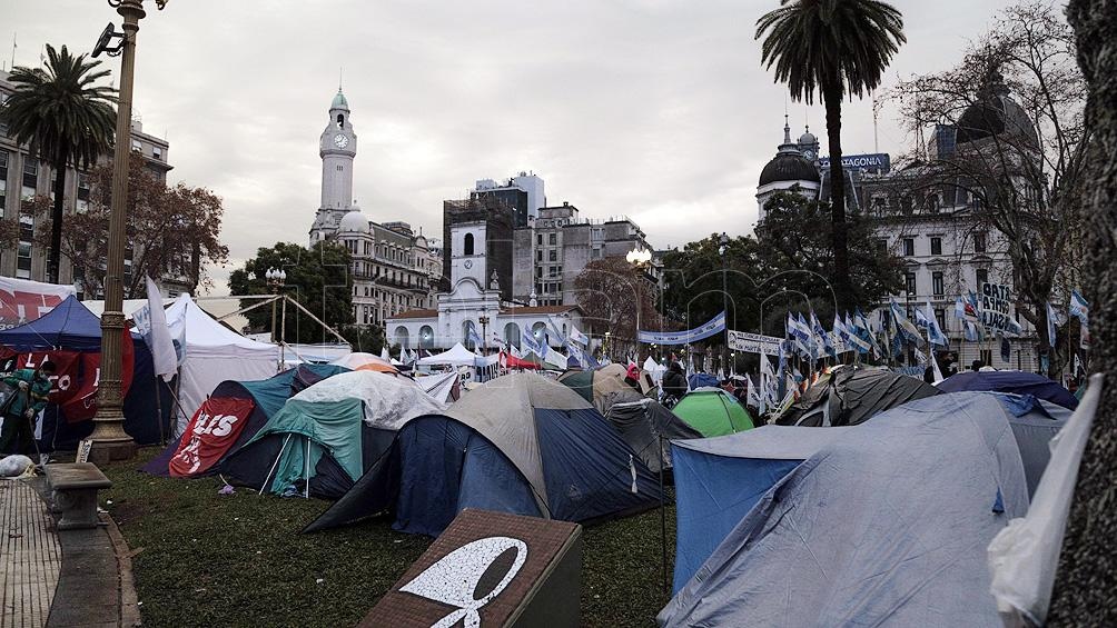 “Fue un anuncio simbólico lo de instalar 2.000 carpas, una por cada día que tienen a Milagro presa en Jujuy. No podíamos hacer semejante movida en el medio de la emergencia con la pandemia”, expresó Garfagnini, pero destacó que se han colocado unos 100 paradores entre gazebos y pequeñas carpas, con algunas ollas populares, en la histórica Plaza de Mayo, donde pasaron la noche.