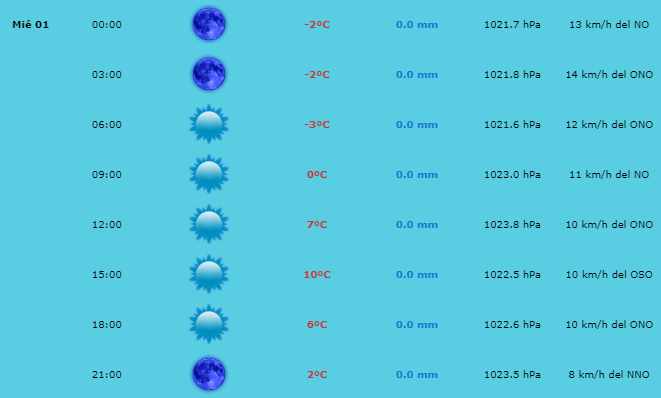 Al mismo tiempo, para el miércoles 1 de junio se prevé una mínima de 2 a 3 grados bajo cero, una máxima de 10 a 12 grados y cielo algo nublado.