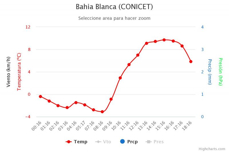 La temperatura máxima de este martes en la zona del Conicet Bahía Blanca fue de 9,7º y se registró a las 15:16, mientras que en el centro de la ciudad el registro térmico más alto fue de 10,1º, informó el sitio Meteobahía.