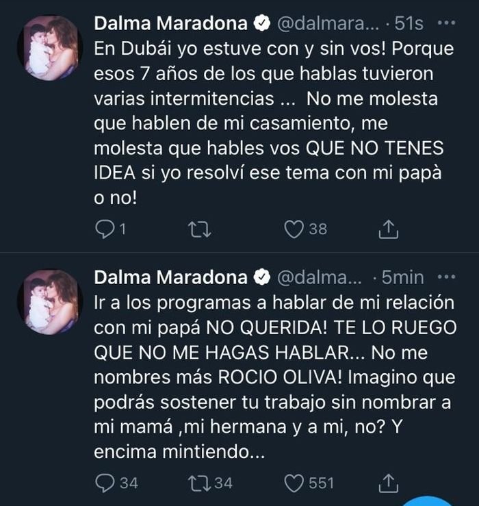 El raid televisivo que hizo Rocío Oliva el lunes por la mañana generó bronca en las hijas de Diego Maradona. La primera en manifestarlo fue Dalma que usó su cuenta de Twitter y le pegó duro y parejo a la ex de su padre.