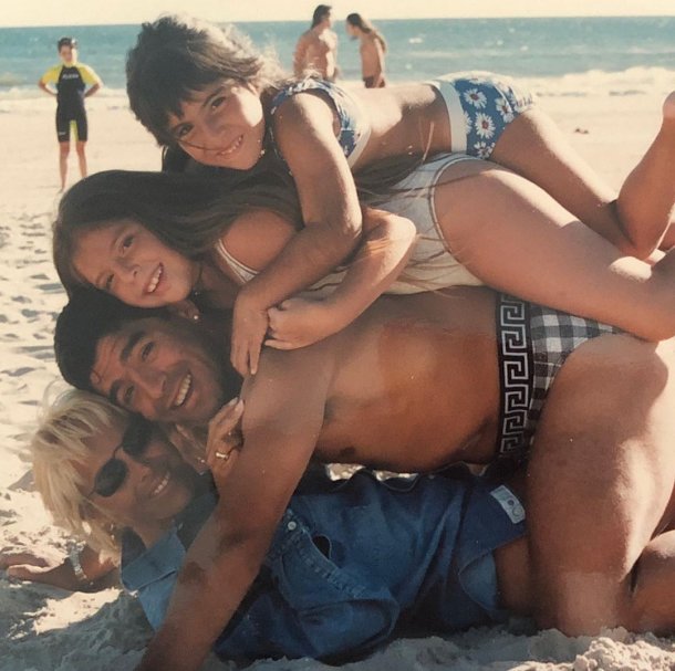 En la foto se los ve a Claudia, Diego, Dalma y Gianinna en la playa, unos encima de otros sobre la arena y sonrientes. Años después de esa postal y tras varios escándalos, Maradona acusa a Villafañe de robarle unos 400 objetos, entre ellos camisetas muy preciadas.
