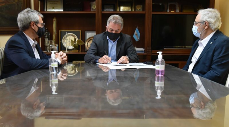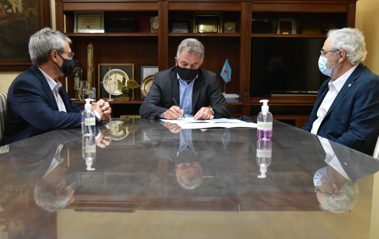 El intendente Héctor Gay formalizó la firma de un convenio con el rector de la Universidad Nacional del Sur, Daniel Vega, para cooperar institucionalmente con la convalidación provincial del Plan Director del Complejo Universitario Altos del Palihue.