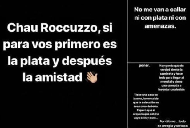 “Chau Roccuzzo, si para vos primero es la plata y después la amistad. No me van a callar con plata, ni con amenazas. La mujer de LM (por Lio Messi) maneja todo, decide a quién sacar y a quién poner. Hay gente que de verdad siente la camiseta y hace todo para llegar al Mundial, y viene una cornuda a inventar una lesión”, rezaba uno de los primeros mensajes.