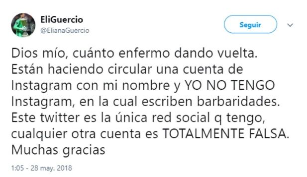 La polémica por los fuertes dichos no tardó en estallar y fue la propia Guercio quien se encargó de aclarar que no se trataba de una cuenta suya. “Dios mío, cuánto enfermo dando vuelta. Están haciendo circular una cuenta de Instagram con mi nombre y no tengo Instagram. Este Twitter es la única red social que tengo, cualquier otra cuenta es totalmente falsa”.