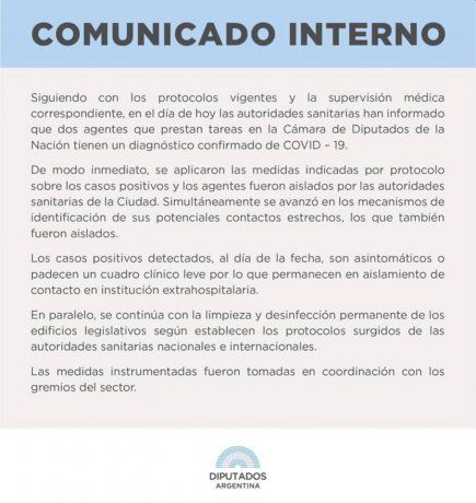 El aislamiento de los empleados estuvo a cargo de las autoridades sanitarias de la Ciudad de Buenos Aires, según determina el comunicado. Por otro lado, se detalla que se estudia la posibilidad de que se hayan establecido contactos estrechos, cuyos confirmados también fueron aislados.