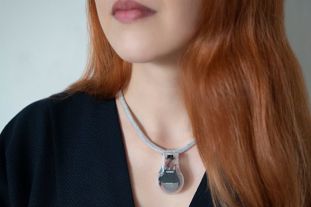 El dispositivo vestible o wearable está equipado con un sensor de proximidad. El colgante se usa en el cuello y el sensor detecta cuando la persona acerca la mano a su rostro.
