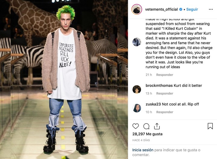 Luego de ver la publicación en Instagram, la viuda de Cobain comentó la imágen diciendo: “Está bien, ¿sólo vas a recrear el vestuario de Kurt en Rolling Stone? Los ricos han infectado todas las culturas“.
