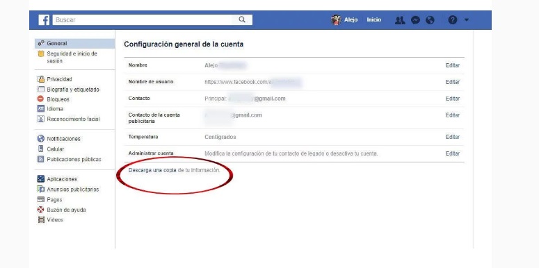 Una vez ahí, en Configuración general de la cuenta, tenemos que elegir “Descarga una copia de tu información”. Ahí podremos crear un archivo que incluya publicaciones, fotos, videos, mensajes y conversaciones y datos de la sección “Información” de nuestro perfil.