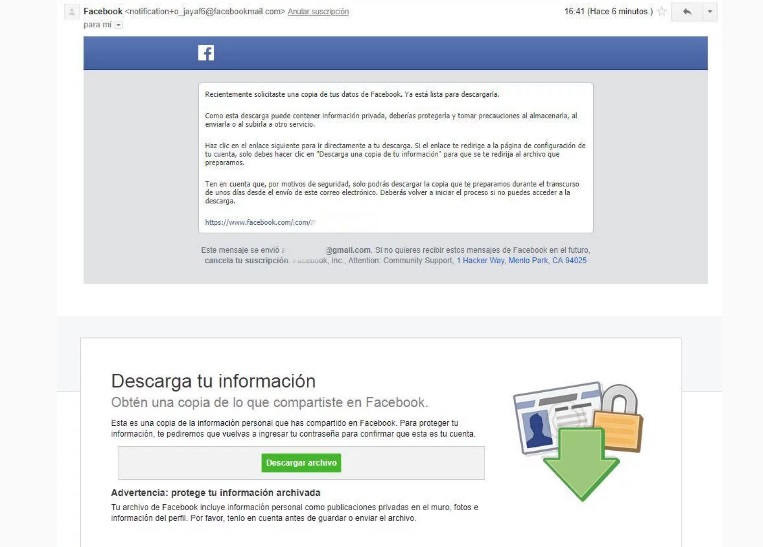 Una vez que hagamos click, Facebook nos enviará un mail con un link para bajar toda la información.