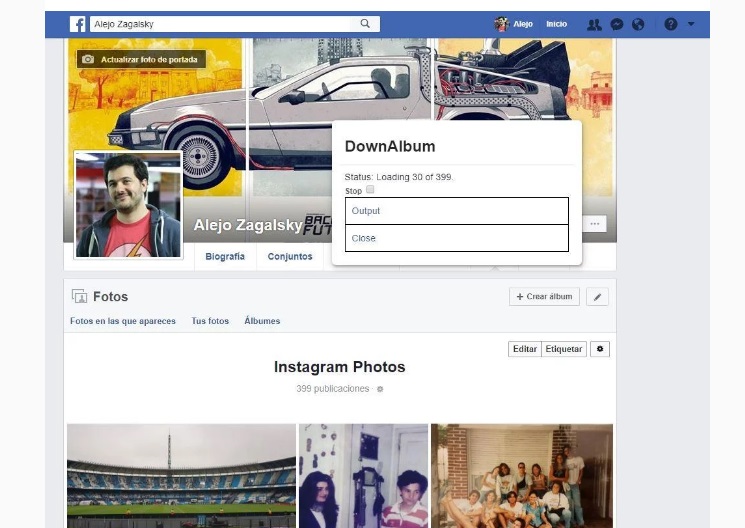 ¿No querés información? No hay problema. Si solamente querés bajar las fotos, podés usar algunas extensiones para tu navegador, como por ejemplo DownAlbum. Una vez que la instalamos, tenemos que ir a nuestro perfil de Facebook y elegir el álbum que queremos guardar y darle click al ícono de la extension y elegir “normal”.