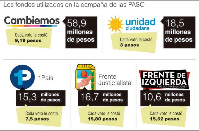 De la información oficial surge que el Frente Cambiemos fue el que más gastó en la campaña: casi 60 millones de pesos. Representa el triple que lo erogado por la Unidad Ciudadana de Cristina Kirchner que informó 18,5 millones de pesos. (Diario El Día)