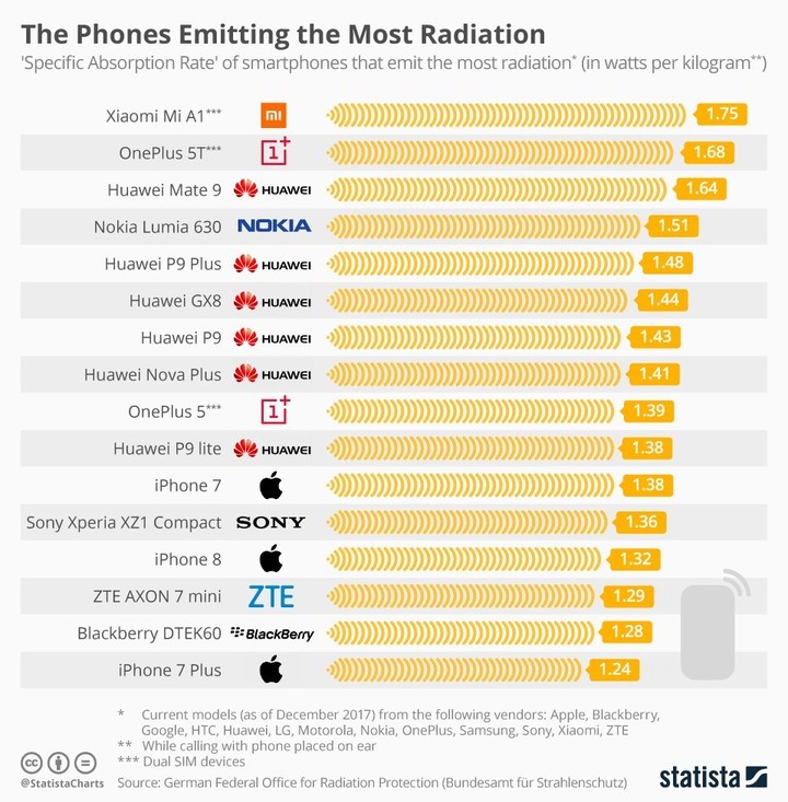 A partir de estos datos, la web statista creó un listado con los smartphones que emiten la mayor cantidad de radiación, teniendo en cuenta que la recomendación general es que no excedan los 2 watts por kilogramo para evitar efectos adversos en la salud.