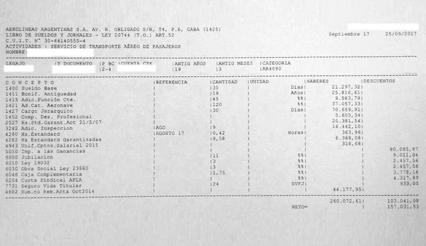 El recibo corresponde al mes de septiembre de este año, tiene desglosados los descuentos que se le hacen al personal de la empresa (casi $80 mil son del Impuesto a las Ganancias) y es de un piloto que lleva 19 años volando en la empresa estatal.