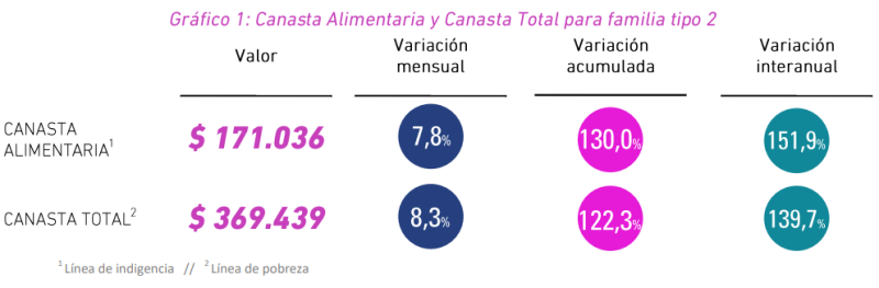 Por su parte, la Canasta Básica Total para la misma familia alcanzó los $ 369.439, que son necesarios para cubrir sus consumos básicos, tanto alimentarios como no alimentarios, y así superar el umbral de pobreza.