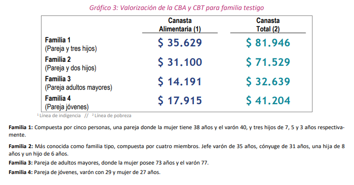 Por su parte, la Canasta Básica Total (CBT) para la misma familia alcanzó los $71.529, que son necesarios para cubrir sus consumos básicos, tanto alimentarios como no alimentarios, y así superar el umbral de pobreza.
