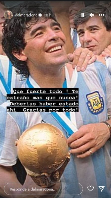 “¡Qué fuerte todo! Te extraño más que nunca! Deberías haber estado ahí… Gracias por todo!“, indicó Dalma en sus historias de Instagram, con una imagen de su papá alzando la copa en México 86.