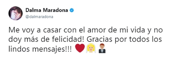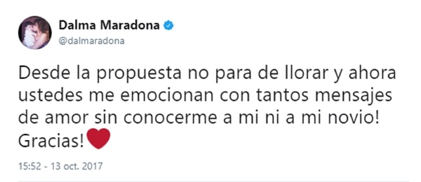 Al ver que su padre ya lo había adelantado en las redes sociales, Dalma se tomó con gracia y utilizó su cuenta de Twitter para manifestar su felicidad: “¡¡Me voy a casar con el amor de mi vida y no doy más de felicidad. Gracias por todos los lindos mensajes!!”