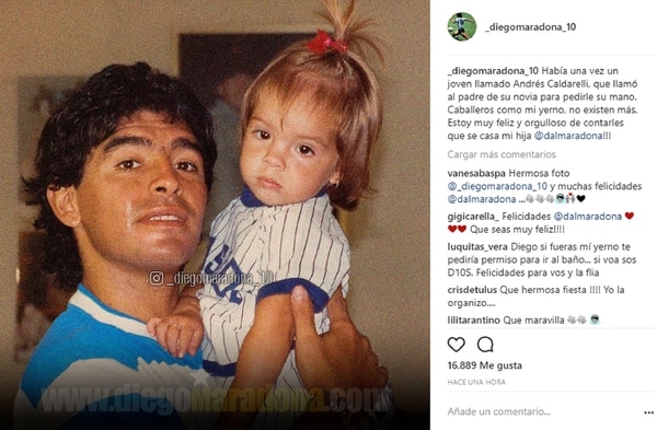 “Había una vez un joven llamado Andrés Caldarelli, que llamó al padre de su novia para pedirle su mano. Caballeros como mi yerno, no existen más. ¡¡¡Estoy muy feliz y orgulloso de contarles que se casa mi hija @DalmaMaradona!!!”, escribió el exfutbolista en su cuenta de Instagram.