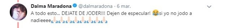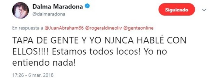 “Dejen de especular! Si yo no jodo a nadieeee”, escribió en una primera instancia la hija del ex futbolista y Claudia Villafañe. Y, luego, cerró: “TAPA DE GENTE Y YO NUNCA HABLÉ CON ELLOS!!!! Estamos todos locos! Yo no entiendo nada!”. (Clarín)