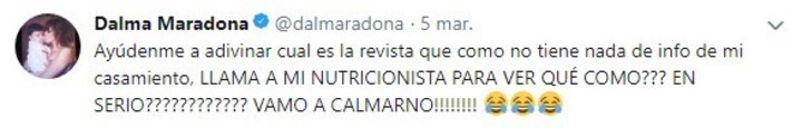 “Ayúdenme a adivinar cuál es la revista que como no tiene nada de información de mi casamiento, llama a mi nutricionista para ver qué cómo. ¿En serio? ¡Vamo’ a calmarno’!”, escribió Dalma con mucho humor, en su cuenta de Twitter.